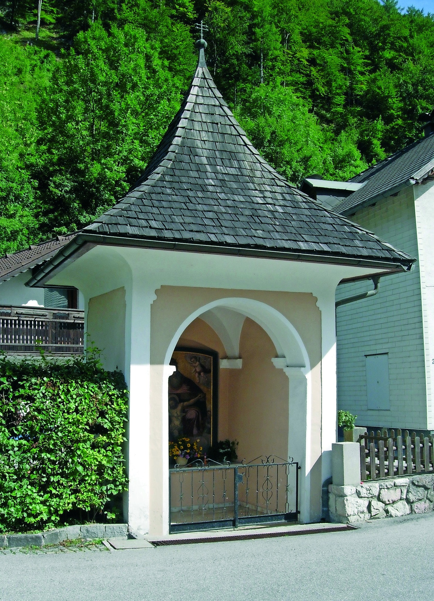 Der ziemlich große, quadratische Bau besitzt ein stark geschwungenes Schindel-Zeltdach und öffnet sich mit einem großen Rundbogen zur Straße. Die Putzgliederung stammt wohl aus dem ausgehenden 18. Jh., innen ist das Kreuzgewölbe sowie das Dreifaltigkeitsbild („Gnadenstuhl“, Bild verm. 19. Jh.) beachtenswert.