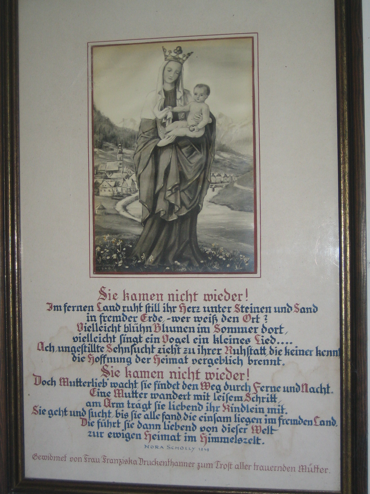 Das große Marienbild ist älter als die Kapelle und stammt nach Angaben der Besitzer aus der k.u.k. Festung Przemysl (Galizien), von wo es vor der russischen Einschließung (Herbst 1914) oder dem Fall der Festung (22.03.1915) noch herausgebracht werden konnte und auf Umwegen in die Kapelle kam.