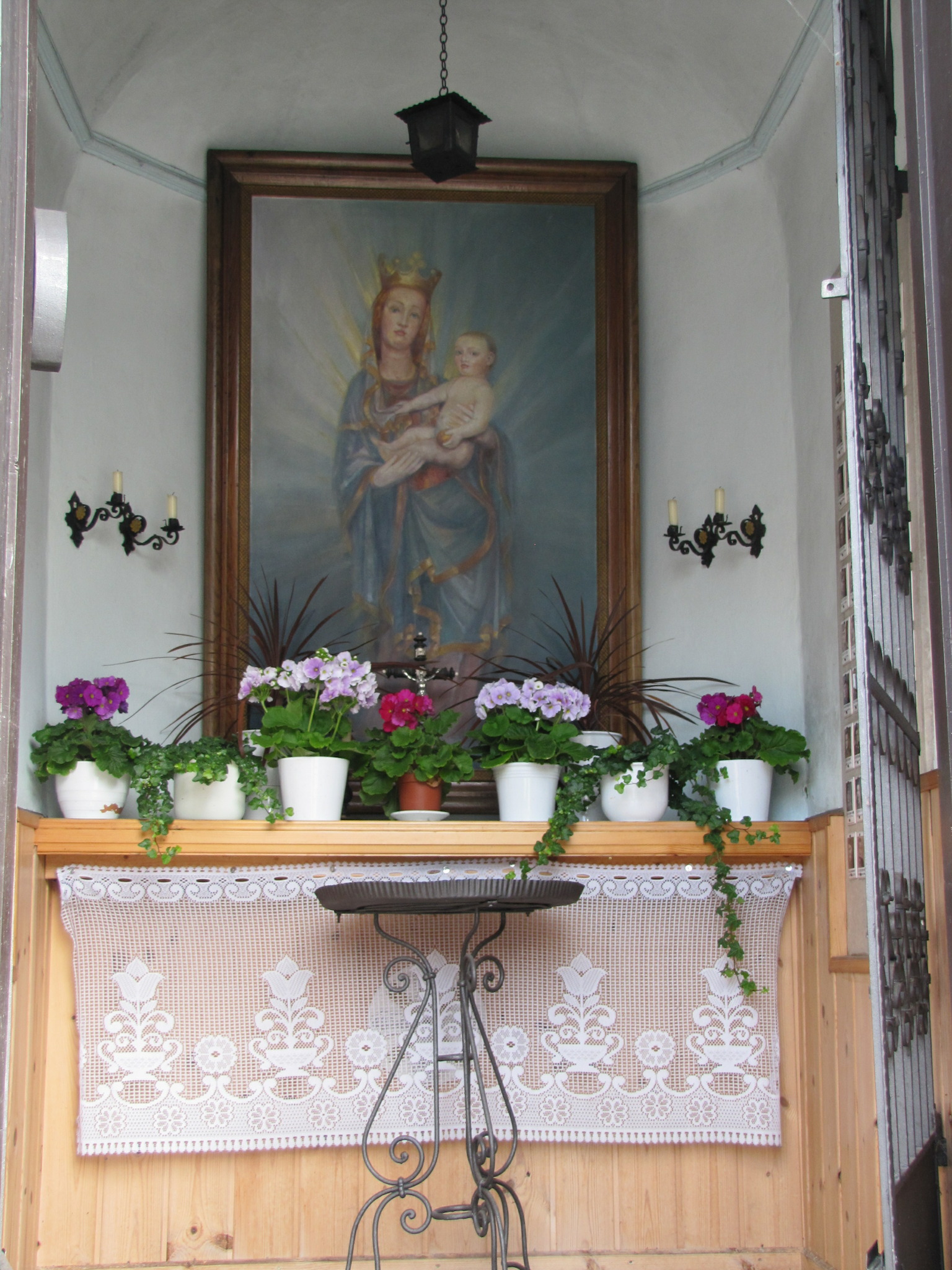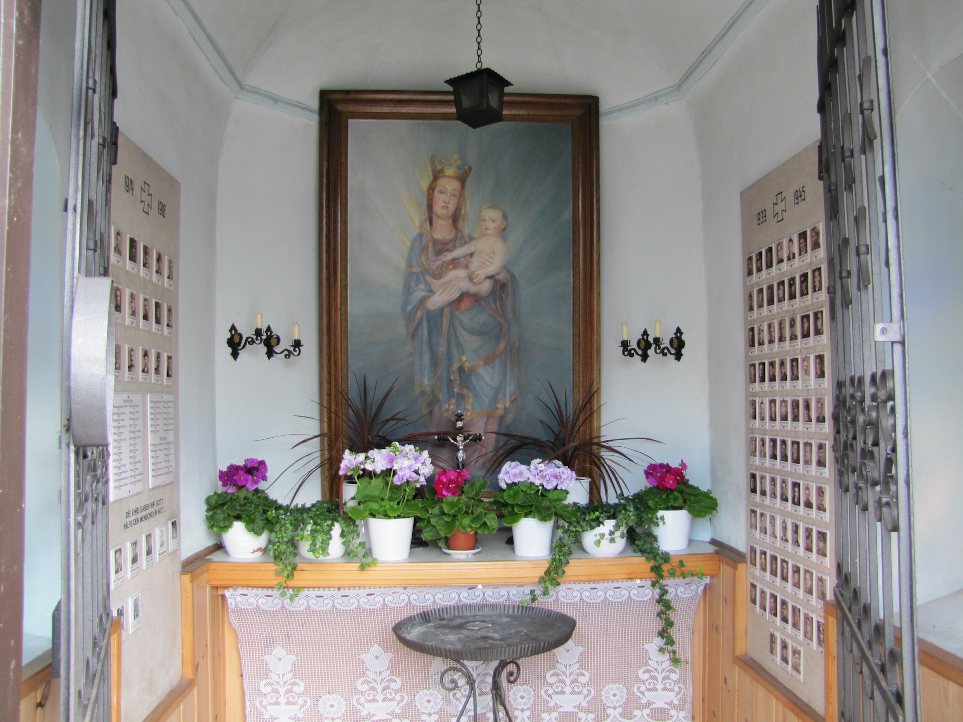 An der Kapelle, einem schlichten Rechteckbau mit rückseitig abgeschrägten Ecken, fällt vor allem der geschwungene Ziergiebel mit Kreuz und bordürengeschmückter Verblechung ins Auge. Das Innere tonnengewölbt, rundbogige Türe und Fenster, an der Stirnseite ein großes Madonnenbild. Das ursprüngliche Bild stammte von Joseph Fraunlob (Ischl), 1869 datiert. Dieses wurde gestohlen und durch ein Bild der Ischler Künstlerin Maria Buchböck (1925-2015) ersetzt. Seitlich je eine Steintafel mit Namen und Bildern der in beiden Weltkriegen gefallenen Reiterndorfer. Außen im Giebel ein Gemälde eines verwundeten Soldaten, das auf diese Tafeln hinweist.