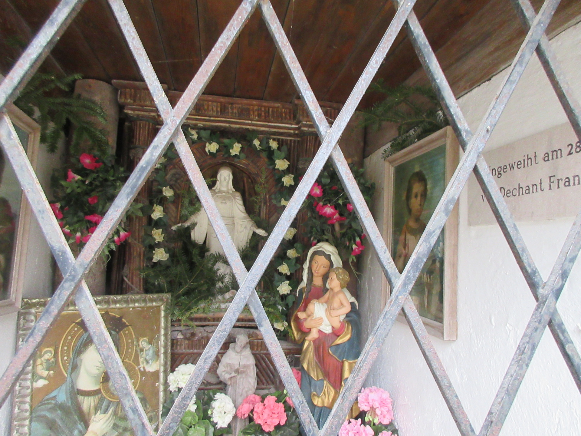 This chapel is made of brick, and has a rounded back. Its furnishings are old. On a wooden “altar table” with embroidered cloth, there is an altar-like structure (all made of barked logs) with a round-arched niche. In the niche is a plaster statue of the Blessing Christ. In front of it is a wooden statue of St. John Nepomuk and two old prints. On the wall there is a stone plaque with the consecration inscription from 1967.
