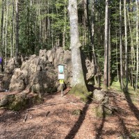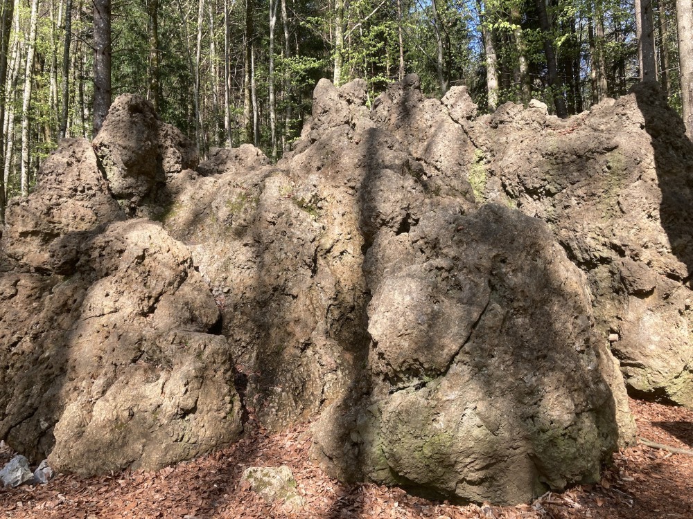 The eremite stone ("Einsiedlerstein") is actually a natural monument, becoming an official monument in 1984. The stone, an almost 5 m high dolomite boulder block broken into two parts, was transported here by the Traun glacier during the Ice Age. It got its name in the Biedermeier period, when in 1825, Henriette von Walter, wife of a wholesaler, had a hermitage built here in the style of a bark chapel and named it "Henriette's Restlessness". Hermitages were a popular element in English gardens at the time. Ten years later, the curious complex was already in decay, but on the top of Siriuskogl Hill, "Henriette's Heights" was emblazoned. The rocks were later painted with fairy tale pictures that have completely disappeared, which is probably why the rock’s names (Eagle’s Stone ("Adlerstein") and Dragon Rock ("Drachenfels")), have not become popular.