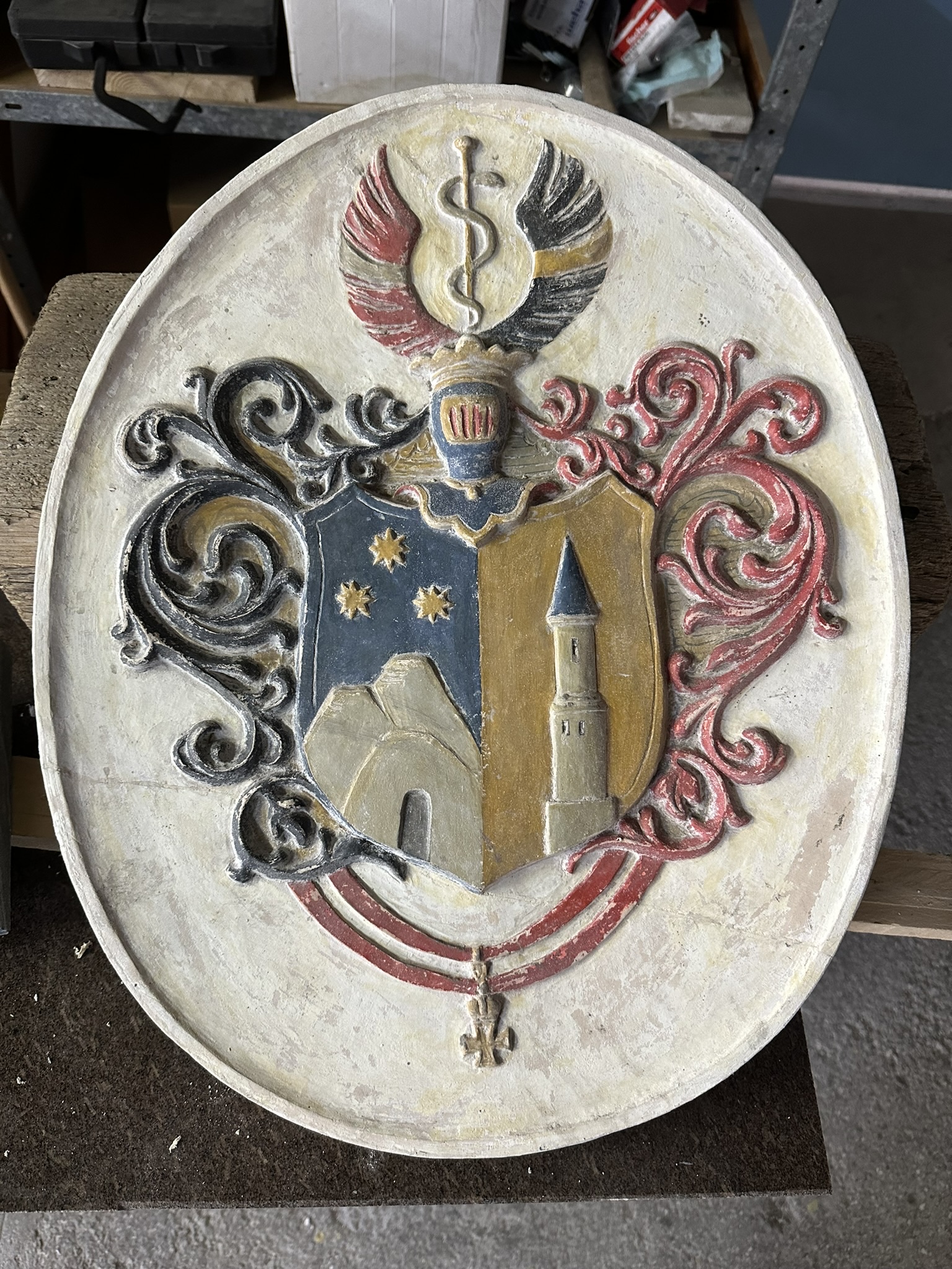 A colored plaster relief of the Wirer coat of arms was attached to the front of the niche above the arches in 1951.