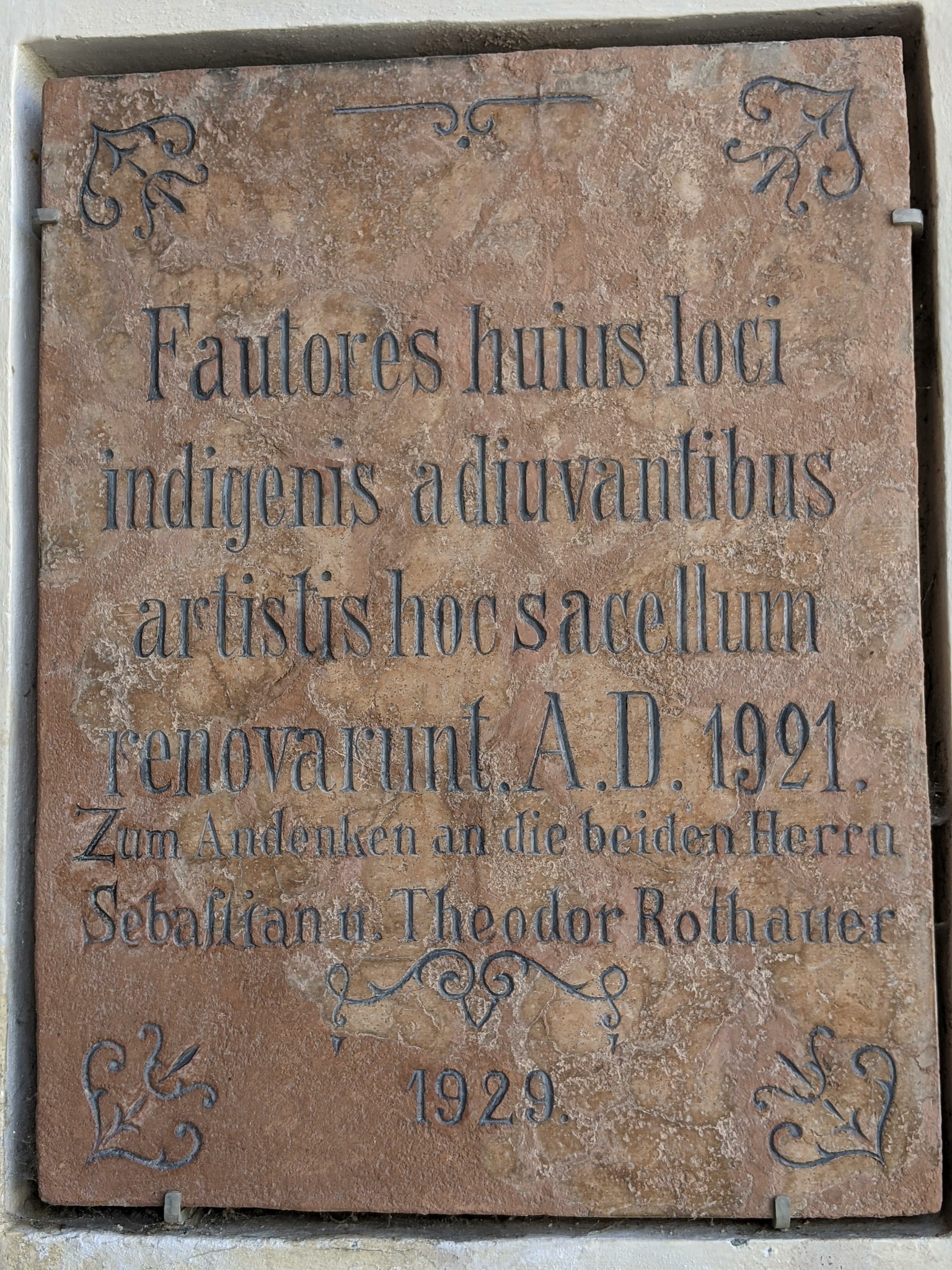 After a flood in 1920, the chapel had to be restored. At that time, the chapel was owned by the Rothauer family. Father and son Rothauer were involved in the restoration not only financially, but also as craftsmen. The inscription refers to them.
