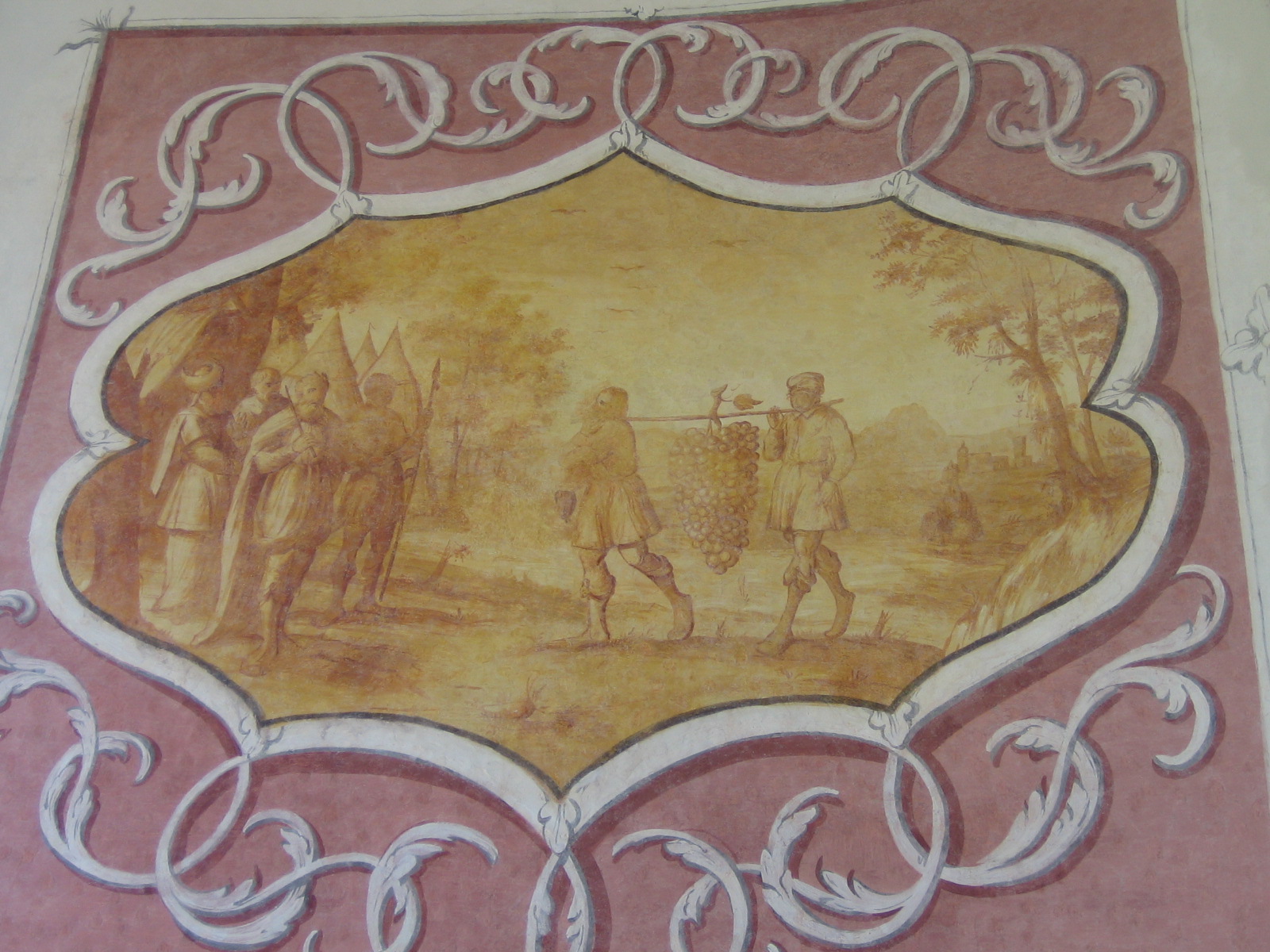 On both sides of "Christ's Walk to Golgotha", there are two frescoed medallions depicting four Old Testament scenes. According to Christian tradition, those scenes foreshadow the suffering of Christ: top left, "The Return of the Scouts from the Promised Land"; bottom left, "The Raising of the Bronze Serpent" (the head of Moses was later erased); top right, "Samson brings down the temple"; and bottom right, "David and Goliath", its placement presumably because the scene is badly damaged.