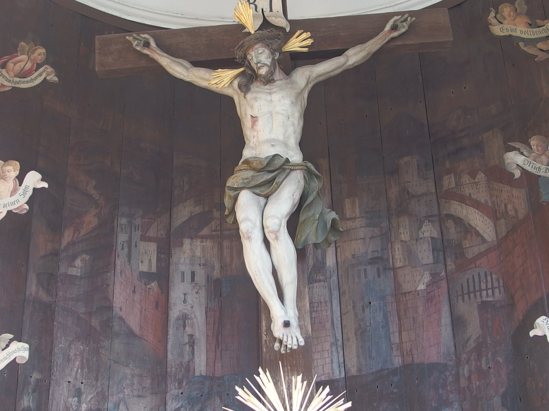 The chapel shelters a life-sized, wood-carved, and completely framed crucifixion group (unknown master artist), which is surrounded by a round dance of angels: seven cut-out-of-boards amorini hold banners with the "Sayings of Jesus on the cross".