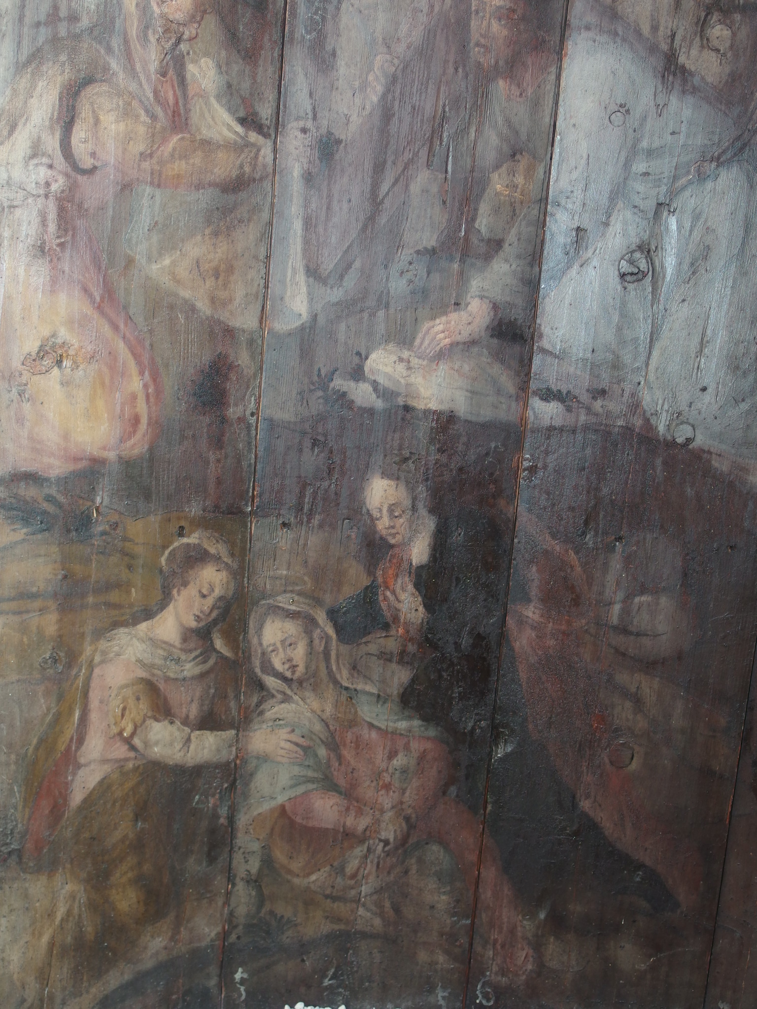 The background of the crucifixion group, painted on boards, is thought to be even older than the statues. If this is true, the painted boards probably came from the first Calvary Church in Ischl, which was consecrated in 1704, and enlarged in 1714 and 1779. The original boards were replaced by copies in 1983, but were returned to the chapel in 2014.