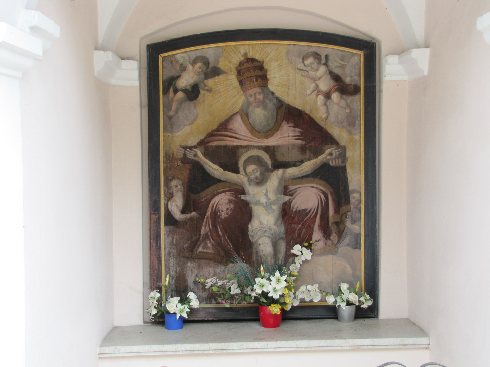 The rather large, square building has a strongly curved shingle tent roof and opens up to the street with a large round arch. The plaster structure probably dates from the end of the 18th century. Inside the chapel, noteworthy are the cross vault and the Holy Trinity picture (picture: Mercy Seat, probably from the 19th century).