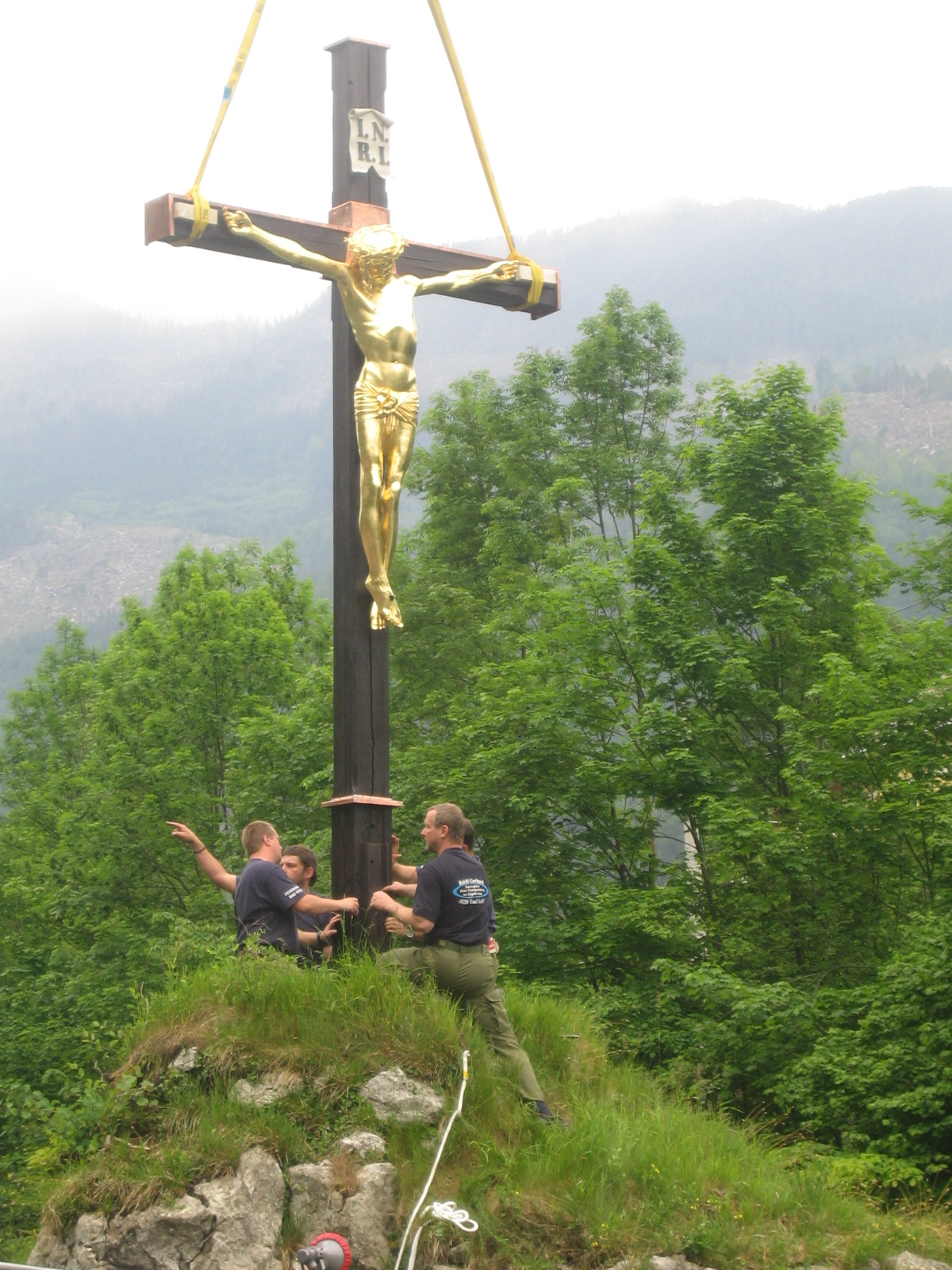 The first evidence of a cross on the “coal rock” (Kohlstein) is provided by a copper engraving dated 1796. Dr. Wirer donated a new cross. The corpus that still exists today was donated in 1855 by court gardener Franz Rauch, who was then commissioned with the redesign of the future imperial summer residence. Since then, the cross has been repeatedly demolished by storms and sometimes found damaged far away in the Traun River. But the greatest damage was caused by the "restoration" of 1975, when the corpus was filled with concrete on the inside. The damage caused by this was repaired during the last restoration initiated by the Cultural Heritage Society of Bad Ischl (Ischler Heimatverein) in 2008. Now, the landmark is in very good condition again. The restored cross was consecrated on 23 May 2008. Unfortunately, the formerly romantic surroundings suffered greatly due to the road construction of the 1970s, but luckily this did not harm the popularity of the Kreuzstein Rock.