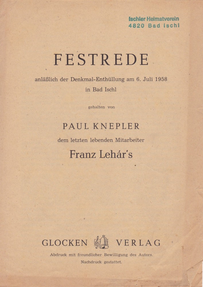The ceremonial speech at the unveiling of the bust was given by Paul Knepler, Lehár's last living coworkter at the time. He ended his speech with the following words: “And just as Lehár's fame will never wither, so the flowers in front of his monument will never wither, but will always bloom anew. And in later days the singer of love and cheerfulness, the great master Franz Lehár, will be remembered here!”
