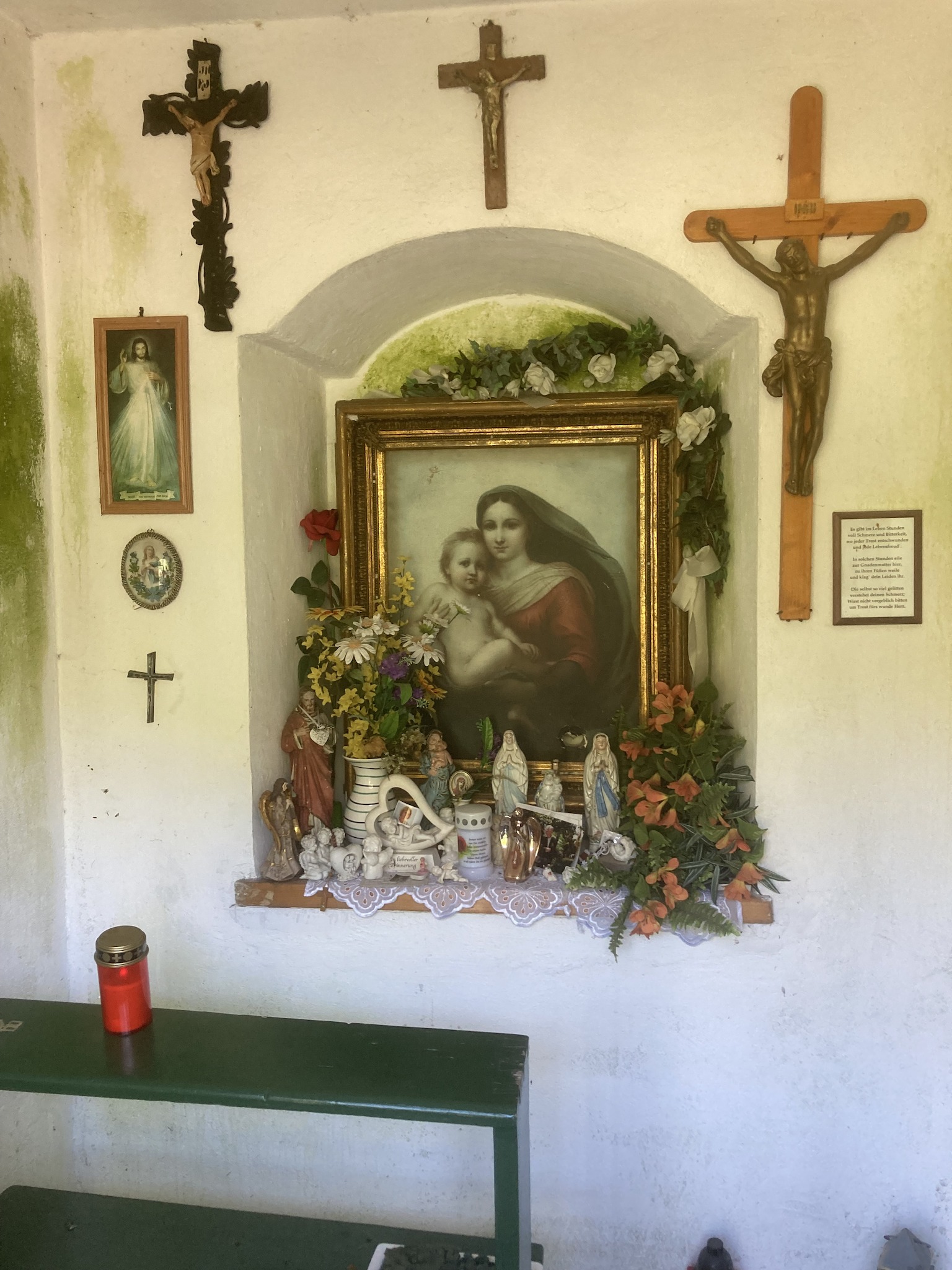 In 2022, in cooperation with the Federal Monuments Office, the Volunteer Fire Brigade of Mitterweissenbach restored the chapel and refurnished it inside: there is a cross on the left, a carved statue of the Virgin Mary protected by a grille in the niche, and an inscription on the right wall designed by master painter Martin Neureiter (Psalm: The Lord is my shepherd...).