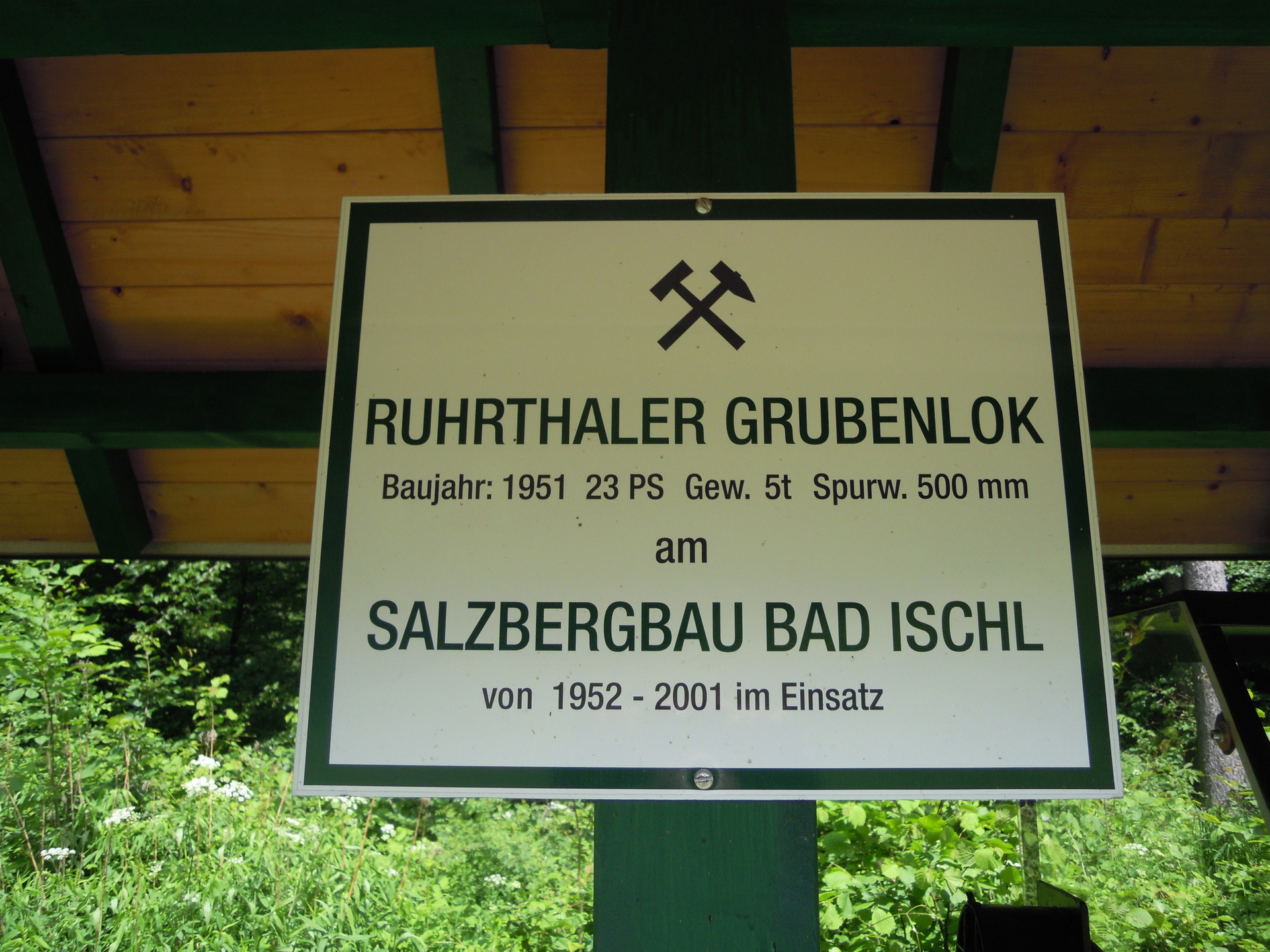The locomotive was built in 1951 by the German company Ruhrthaler Maschinenfabrik Schwarz & Dyckerhoff GmbH (Mülheim/Ruhr). It is actually in running condition. Together with one of the mine wagons, formerly used for visitor transports, the locomotive was placed under a platform-like protective roof on a piece of mine track that leads to a symbolic tunnel mouth.