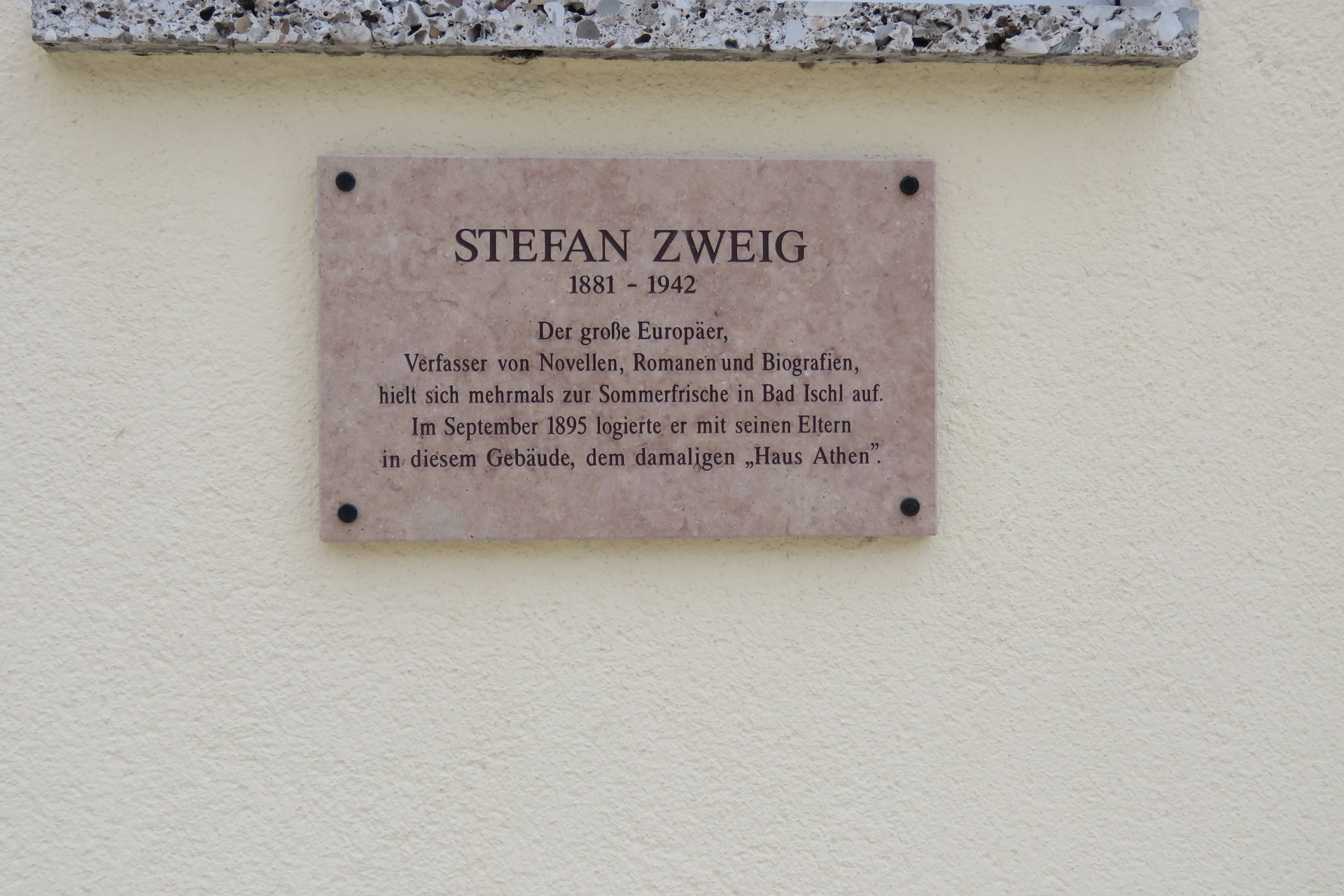 For the Zweig family, it was good manners to spend the summers in Ischl. Stefan Zweig considered the visits more as a compulsion, and it was only later that he had nostalgic memories of his time in Ischl. In 1890 and 1891 he stayed in Bad Ischl for the first time. In 1895, the family stayed at the Haus Athen, where the commemorative plaque is placed. Further stays were in 1899 and 1900. Zweig gaves us a touching view of the post-war Ischl of 1919 in his work From a Closed World (Aus abgesperrter Welt).