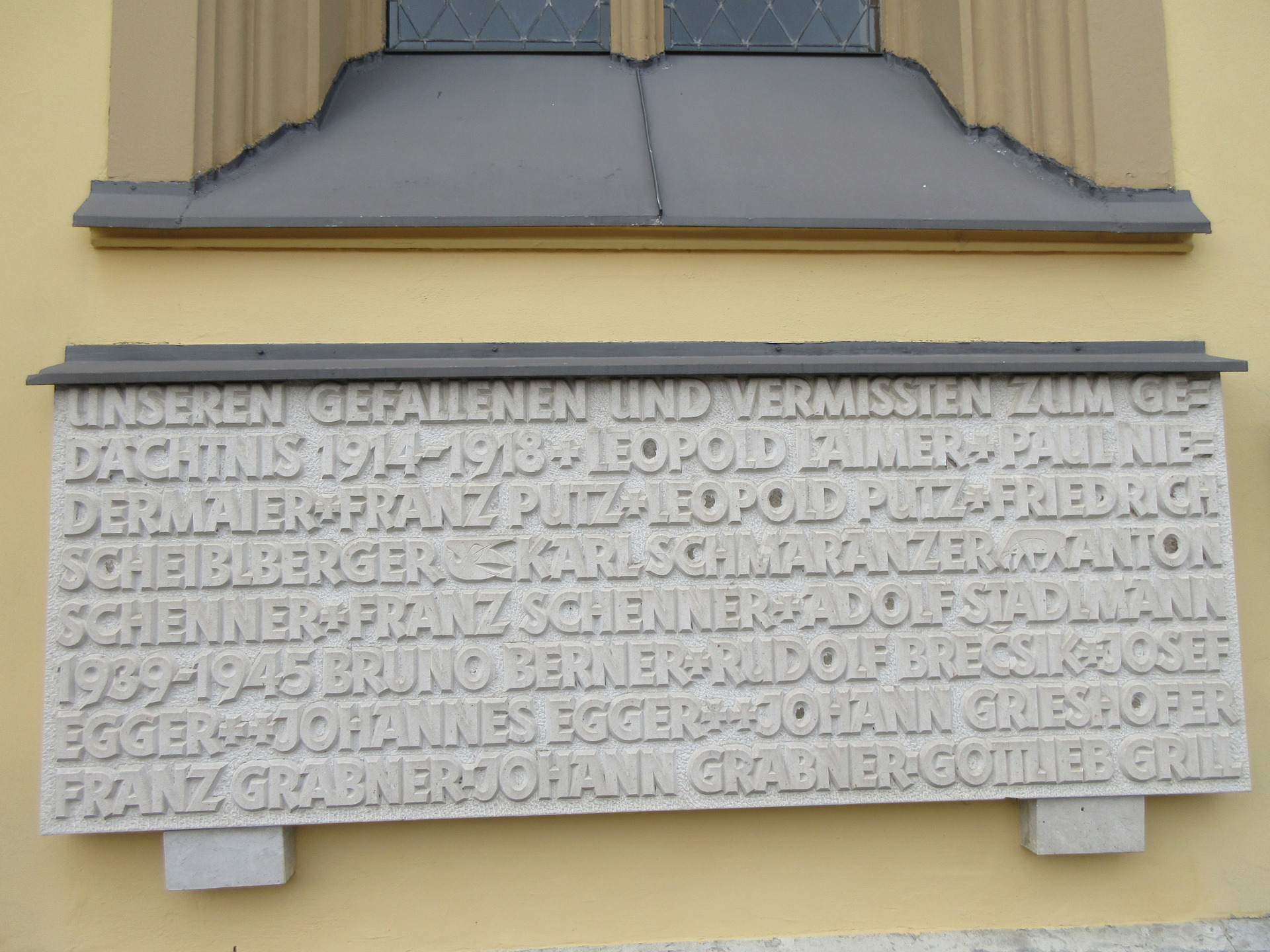In 1963, as a replacement for two smaller plaques inside the church, two plaques were installed on both sides of the entrance for parishioners who died in 1914-18 and 1939-45.