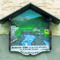 The wayside crosses were erected around 1887, and are panel paintings on wood. The scene shows the "Wilder Lauffen" rapid with the "Windensteg" bridge to the south. Interestingly, the railway is missing. In the water you can see a boy, apparently the victim in this scene.