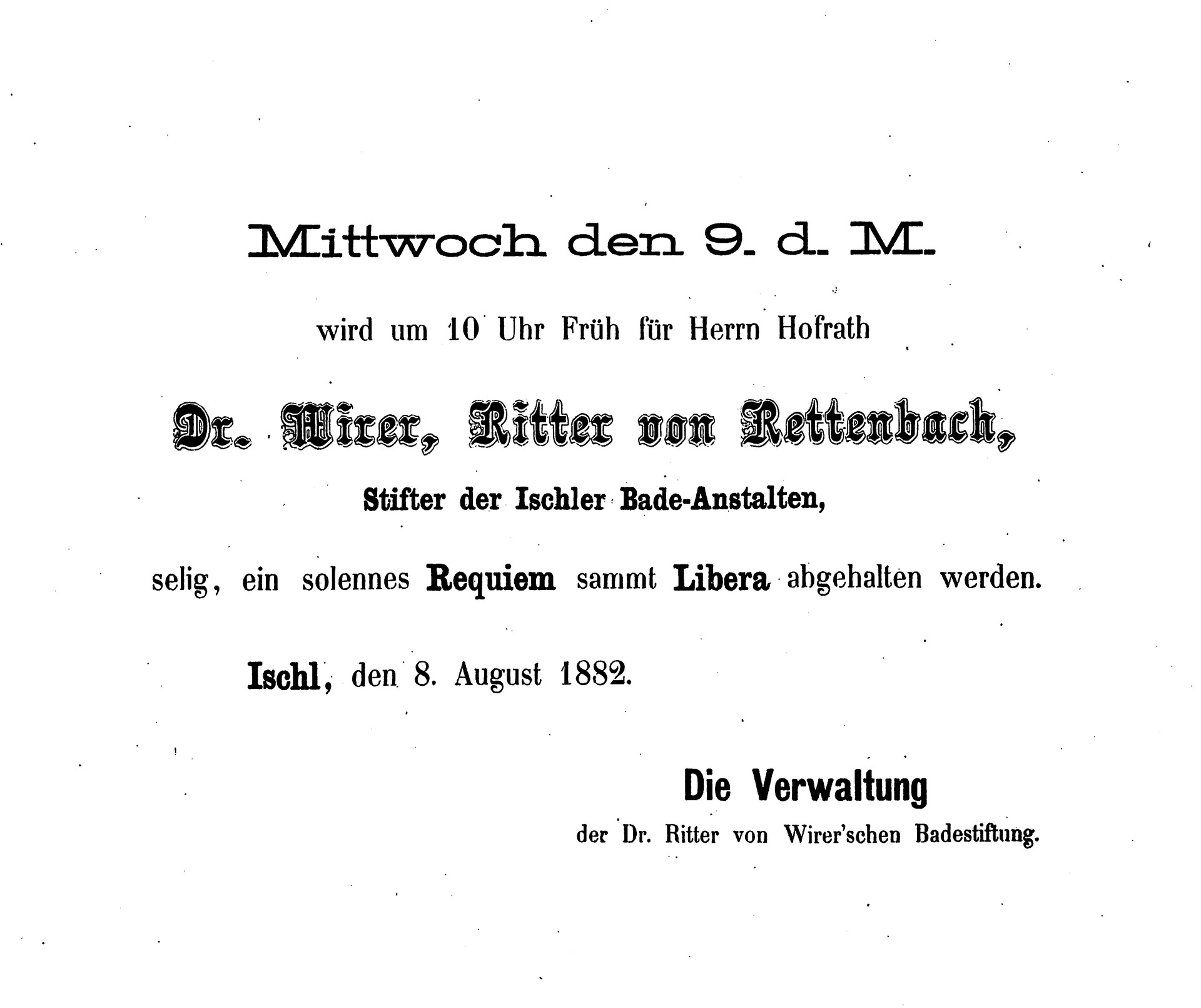 The Viennese physician Dr. Franz Wirer (1771 - 1844) gave Ischl its reputation as a world-class spa resort and an "imperial town", which continues to this day. He was constantly striving to perfect the spa facilities and beautify the whole area, using large sums of his personal fortune. In addition, he used his contacts with the highest Viennese circles to have prominent spa guests visiting Ischl, who in turn also appeared again as patrons of the town. His work for Ischl was of immense value. For example, for Archduchess Sophie (see also Franz-Karl Fountain and Memorial Stone on the esplanade), together with her personal physician Dr. Johann Malfatti, he prescribed the fertility-promoting spa treatments which led to the birth of the "Salt Prince" Franz Joseph and introduced the most glamorous period in Ischl's history.