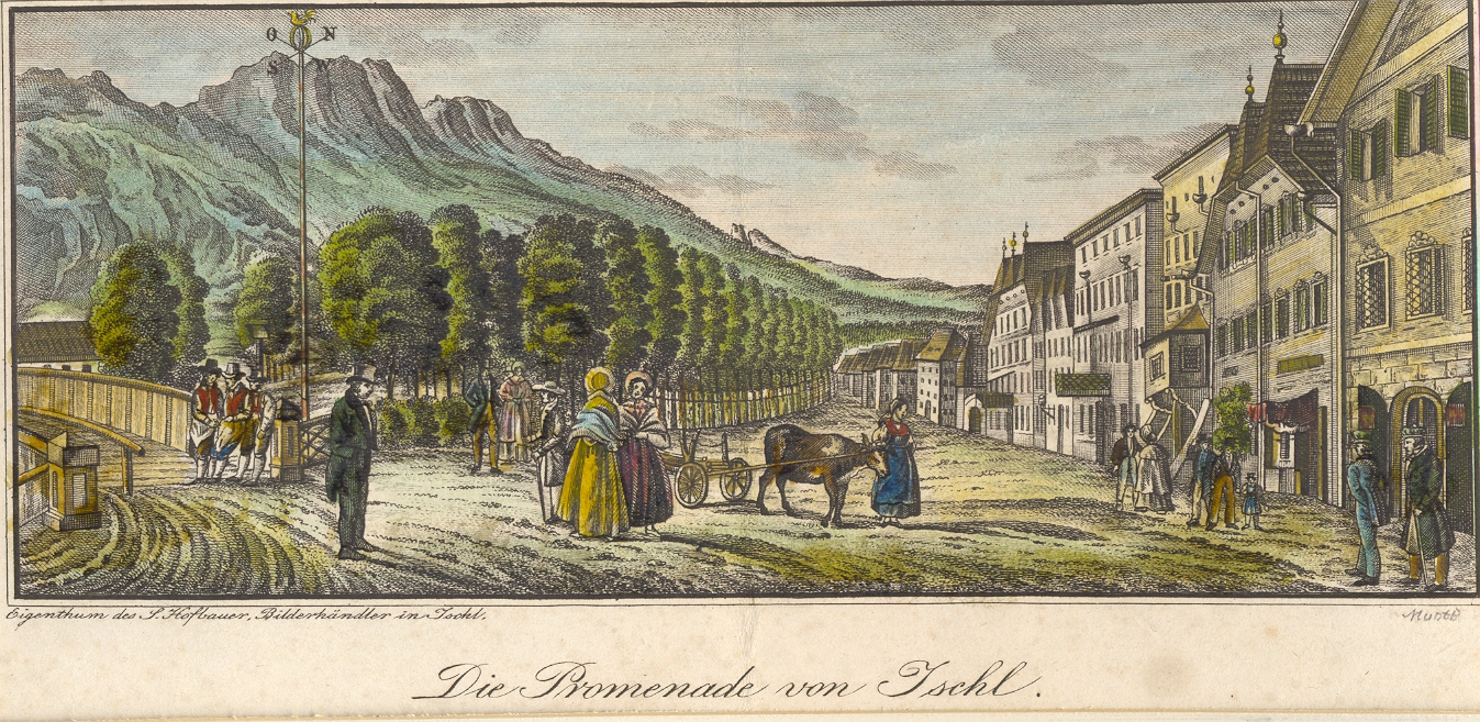 Bild der Esplanade eines Salinenzeichners. Vermutlich hat Rudolf von Alt sein Bild nach diesem Bild gemalt, wegen der Ähnlichkeit der Positionierung der Personen. Rudolf von Alt war für sein Bild nicht persönlich in Ischl.