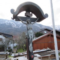 Ziemlich großes Kreuz (Dreinageltypus) aus ungefasstem Eichenholz mit geschwungenem und mit Treibarbeit verziertem Blech-Schutzdach, an der Fußstütze Inschrift: 1937.