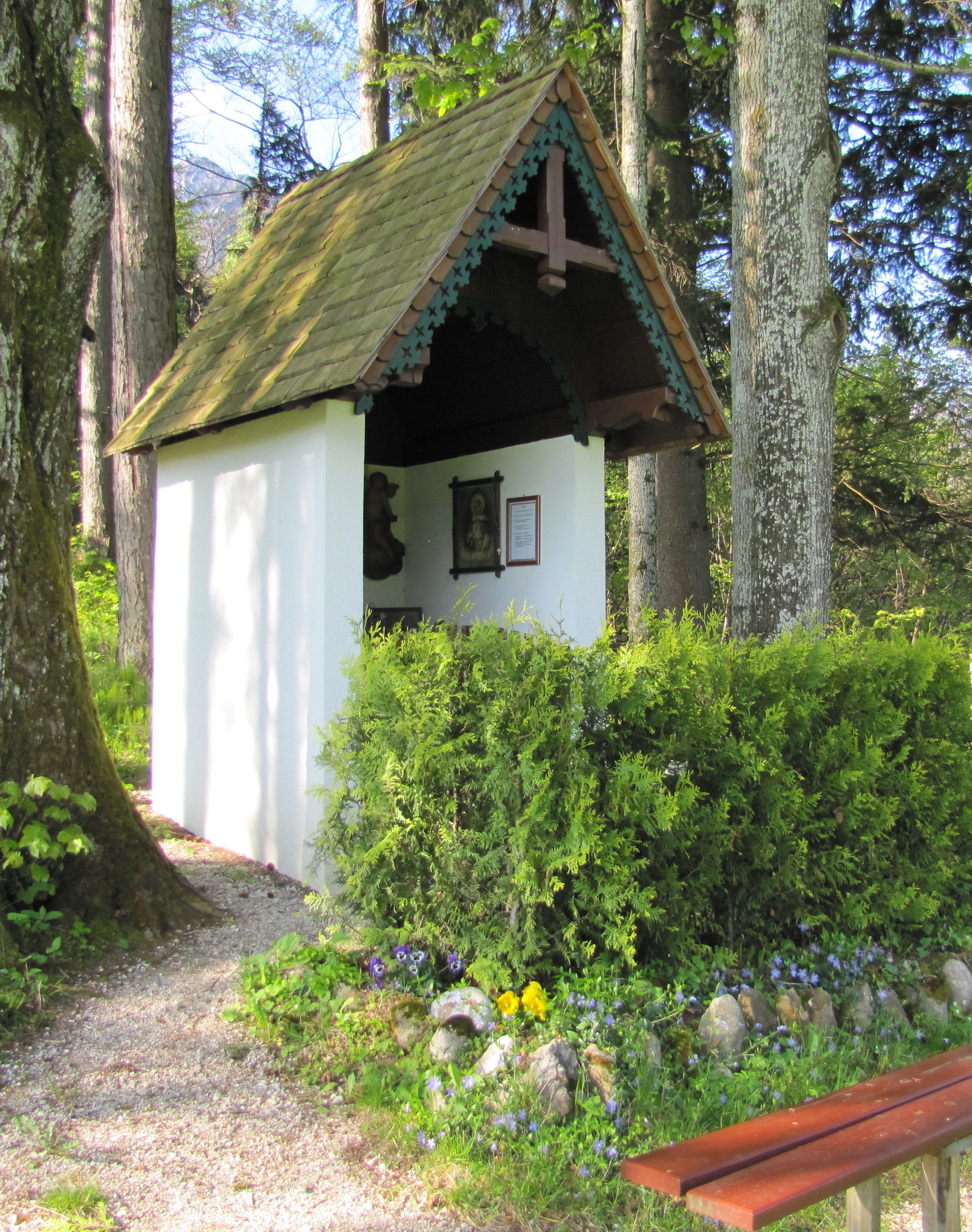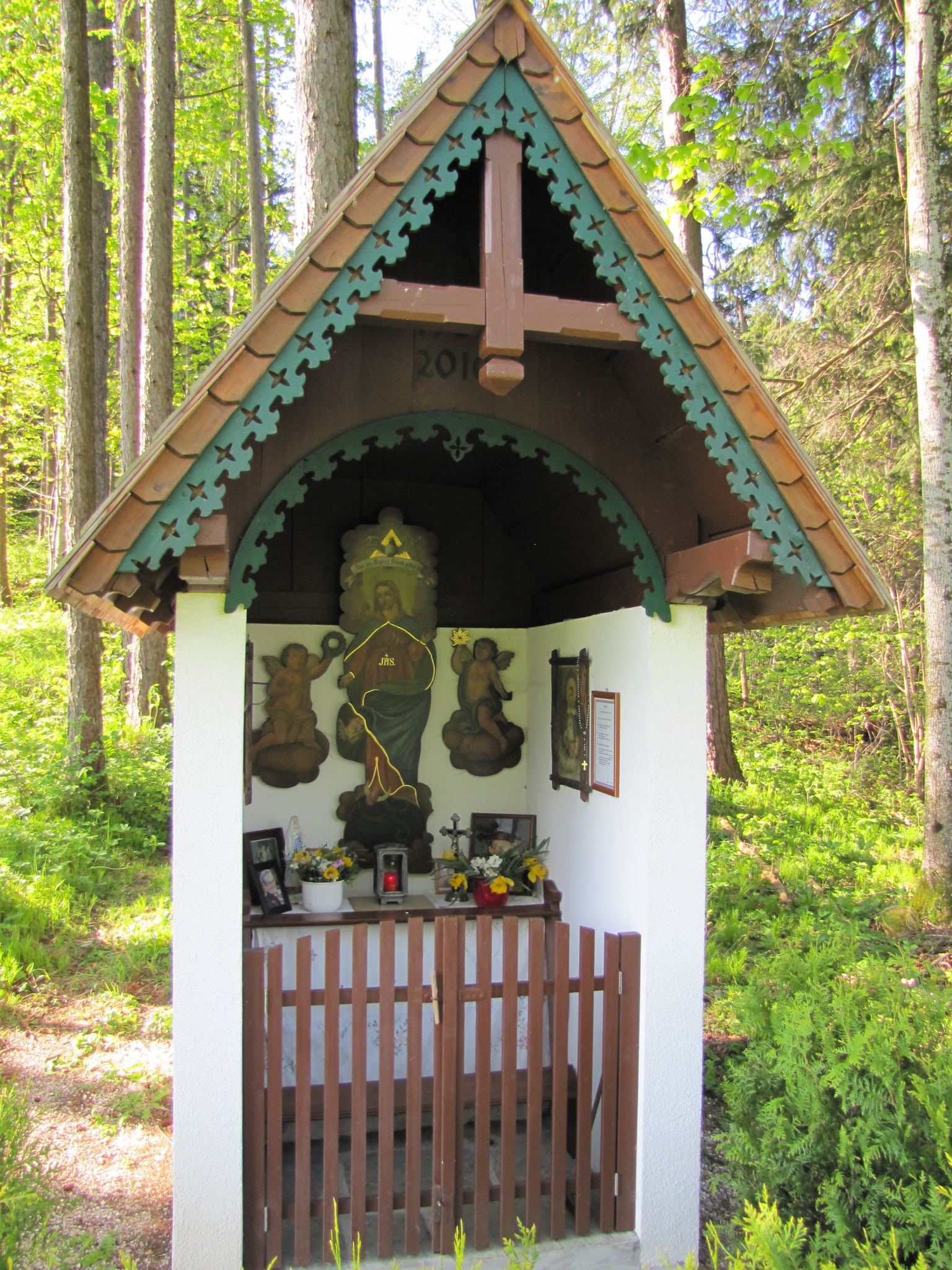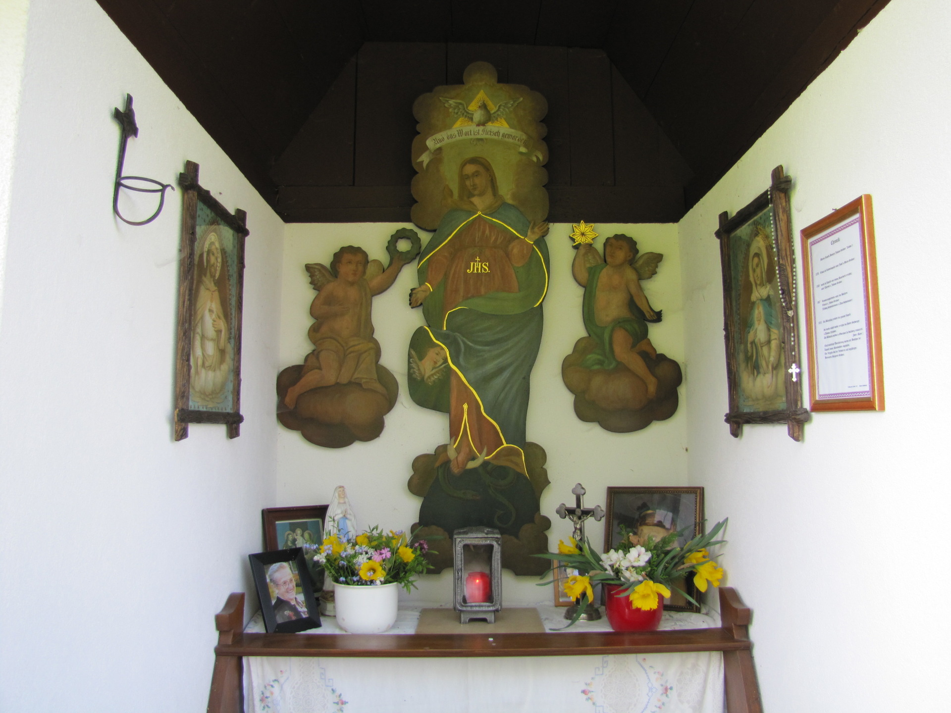 Bei diesem begehbaren Bildstock mit auffallend steilem Schindeldach ist vor allem die Einrichtung bemerkenswert, im besonderen die in barocker Tradition aus Brettern ausgeschnittene große Marienfigur (die Schlange zertretend), flankiert von zwei ebensolchen Putti. Das Bild ist mit K[arl] Wutschl 1887 signiert, was aber vielleicht nur eine ältere Restaurierung anzeigt. Die Figuren könnten auch älter sein.