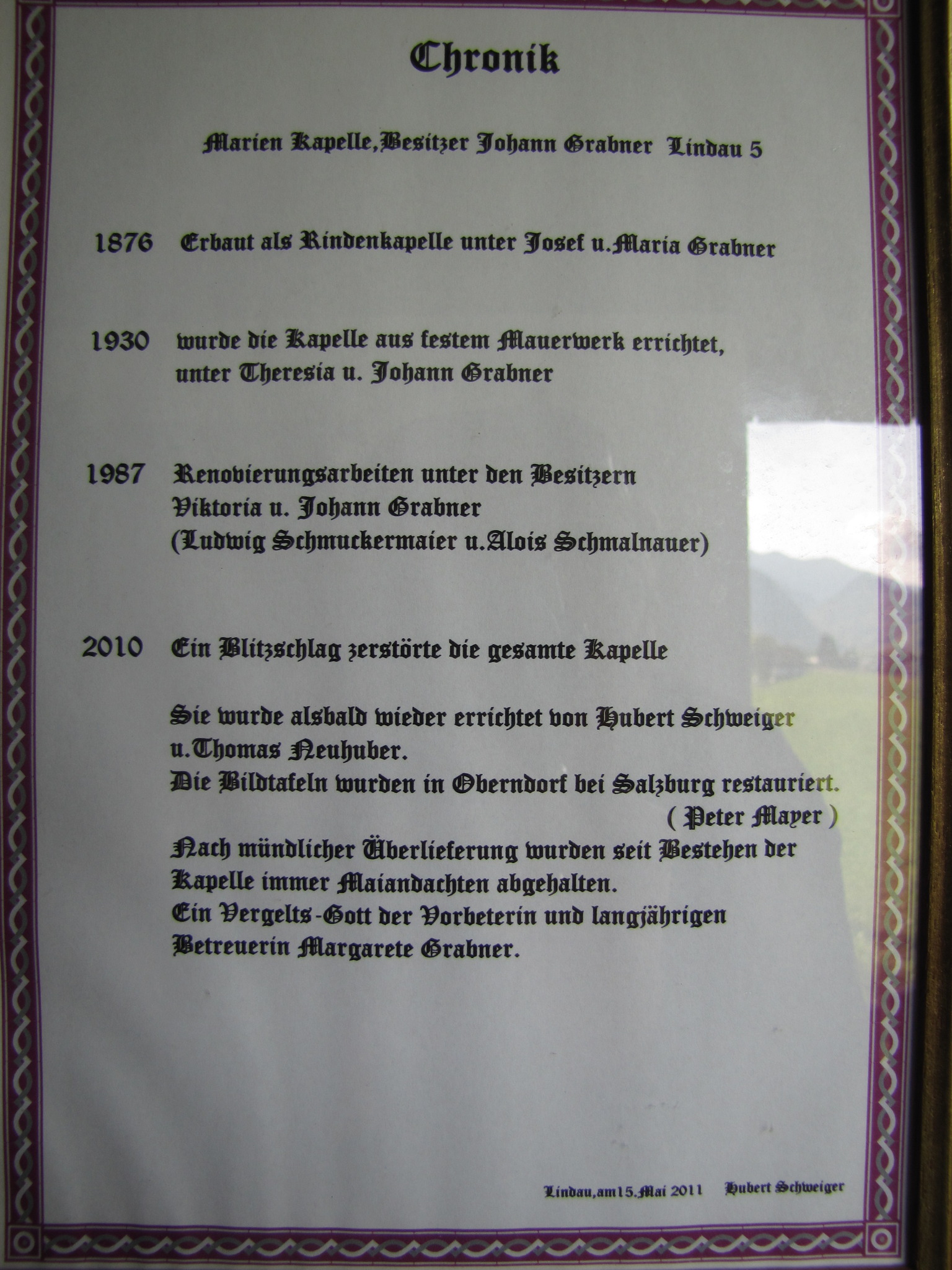Der Tradition nach haben hier die „Grabnerwirt“sleute 1876 eine Rindenkapelle erbaut, die 1930 zum Teil in Mauerwerk erneuert worden ist. 2010 wurde die Kapelle nach Beschädigung durch Blitzschlag tlw. neu hergestellt, die wiederverwendete Einrichtung restauriert.