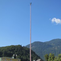 Ein hoher sich verjüngender, spiralig rot-weiß gestreifter Holzmast (rund, unten vieleckig) trägt an der Spitze eine vergoldete Kugel, eine Windrose und den namengebenden Wetterhahn.