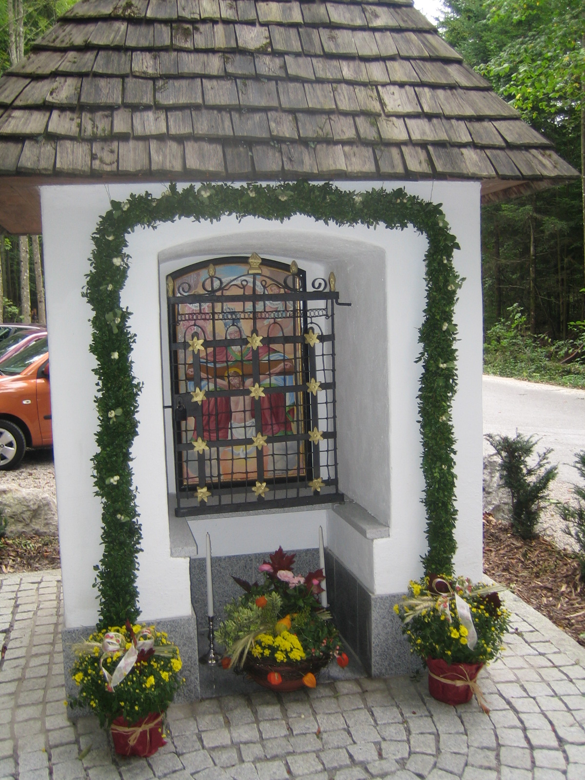 Kleiner, bis 2006 alt wirkender „begehbarer Bildstock“ mit gewölbter Nische und (etwas unsymmetrischem) Schindel-Zeltdach. In der Nische ein Tafelbild „Gnadenstuhl“ (Gottvater, gekreuzigter Jesus, Hl.-Geist-Taube) mit Engel und Spruchband (19. Jh., Kopie von 1989). Vor dem Bild ein dünnes Eisengitter mit Draht-, Blech- und Holzappliken.