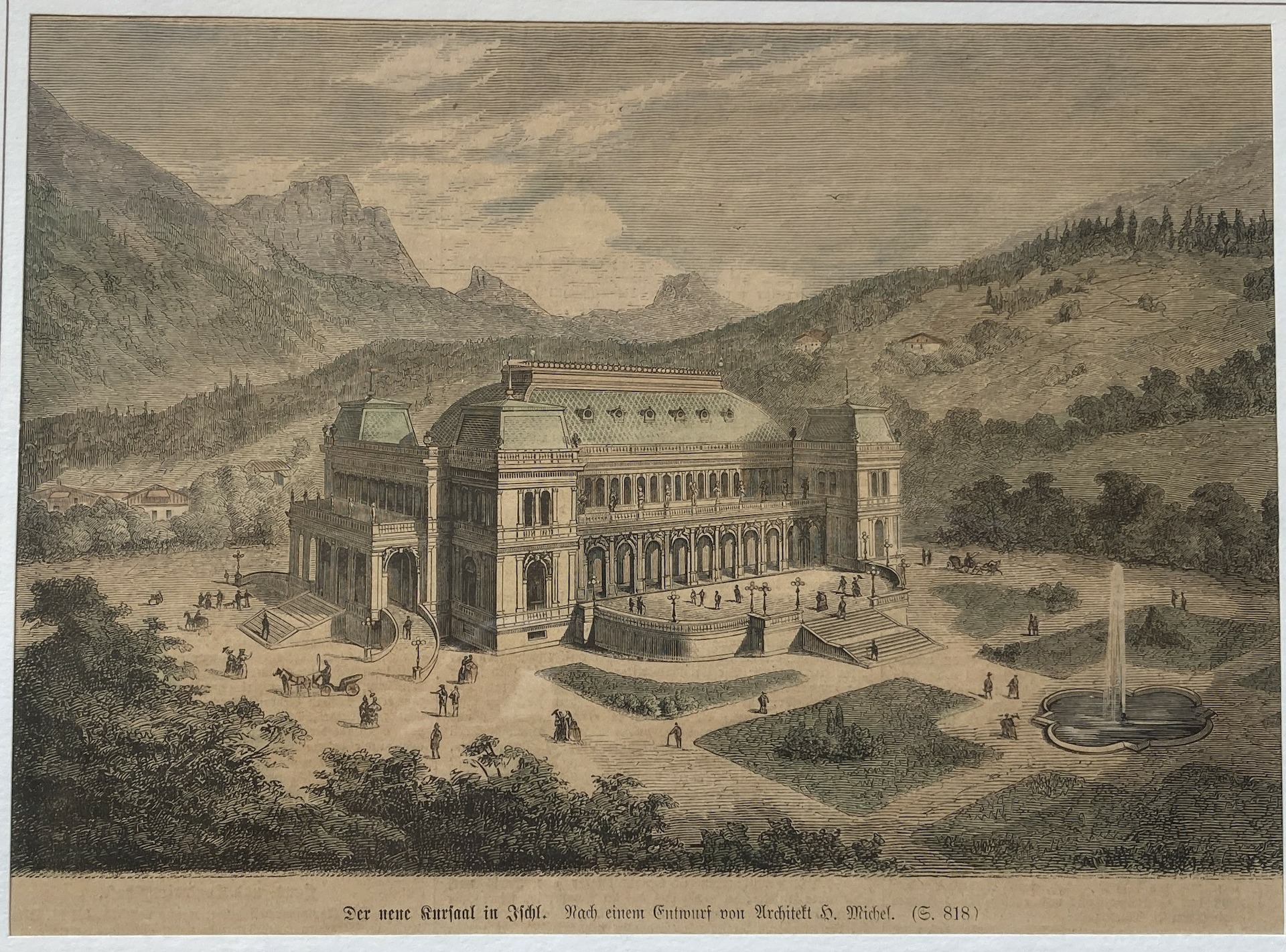 Architekt Hyazinth Michel plante für Ischl einen „Cursaal“, der 1875 eröffnet werden konnte. Der Kuppeldachstuhl und die 4 Türme geben dem Haus seine besondere Note. Es sollte der „Vereinigungspunkt für die aus allen Ländern zusammenströmenden Fremden“ werden.