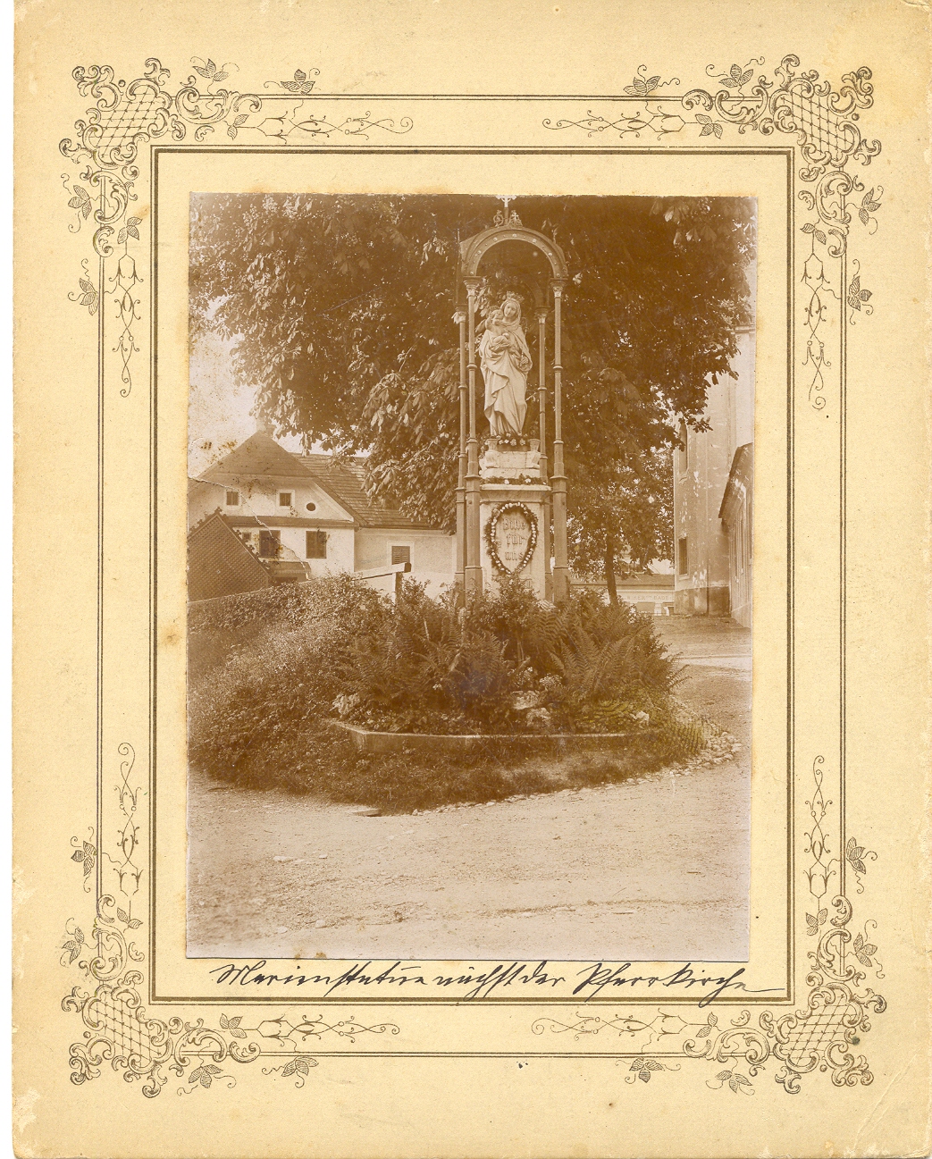 Die lebensgroße Terrakotta-Statue einer gekrönten Hl. Maria mit dem Jesuskind steht auf einem neueren Steinsockel unter einem kuppelförmigen Baldachin aus zarten Gusseisen-Profilen. Ursprünglich hatte die Figur einen einheitlichen hellen Anstrich, der den Eindruck von Marmor erwecken sollte, die Attribute Krone, Szepter und Weltkugel waren vergoldet. Der Baldachin war ursprünglich dunkelgrau gefasst und mit Gold-Akzenten bereichert.