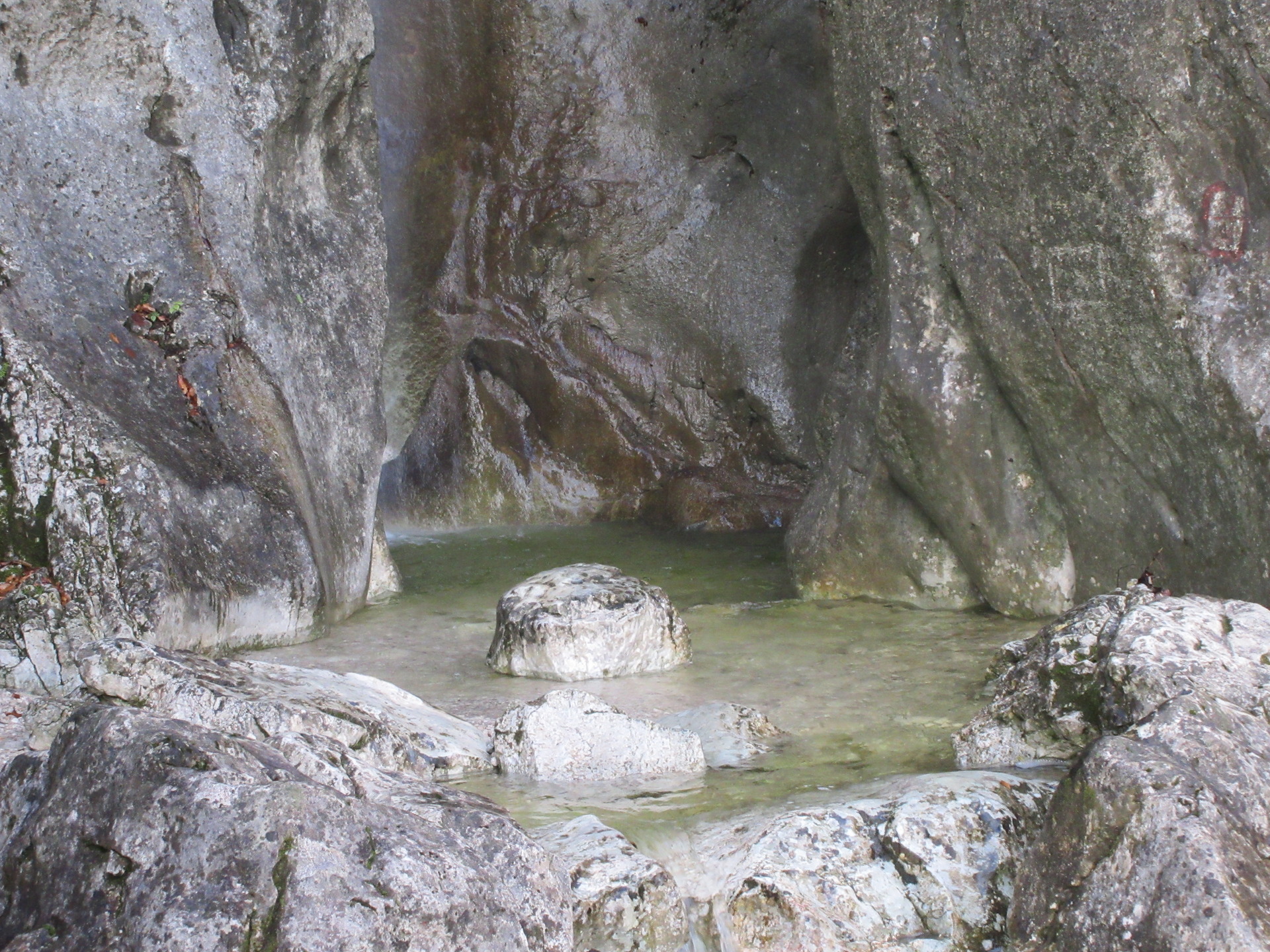 Das detailreich verfertigte, teilweise verschindelte Holzkästchen mit Satteldächlein auf einem abgefasten Holzpflock steht direkt an der Felswand und ist außen zur Gänze grün gestrichen, die tiefblaue Färbelung des Inneren kommt auch anderwärts vor und scheint einige Zeit modern gewesen zu sein. Im Kästchen nur ein alter Druck, auf dem Jesus und Maria-Magdalena (?) dargestellt sind (Unterschrift: So nimm denn meine Hände und führe mich – Beginn eines 1862 veröffentlichten Gedichts)