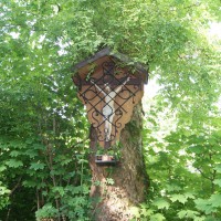 Etwas größeres Kreuz mit Satteldach und geschwungener Rückwand, an einem Baum hängend. Deckend gestrichen (braun und ockergelb), der volkstümlich geschnitzte Corpus naturalistisch gefasst.