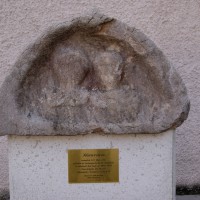 Der 1994 bei Grabungsarbeiten der Saline in den „Sulzbachfeldern“ gefundene Stein soll aus dem 1. bis 2., nach anderer Quelle erst aus dem 2. bis 3. Jh. n. Chr. stammen und bildete entweder den Oberteil eines römischen Grabmonuments oder den Deckel einer sogenannten Aschenkiste (d.i. ein sargähnlicher, jedoch kleinerer Behälter für die Asche einer Brandbestattung). Möglicherweise wurde er in einer regional tätigen Werkstatt verfertigt, die auch in St. Georgen / Attergau, Mondsee und Salzburg gefundene Römersteine hergestellt hat.