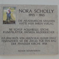 Die Gedenktafel für die Künstlerin Nora Scholly besteht aus Untersberger Marmor und wurde von Steinmetzmeister Günter Brucker gestaltet. Eine Besonderheit stellt die Darstellung der Schutzmantelmadonna dar, die ein Lieblingsmotiv von Scholly war. Die Tafel wurde vom Ischler Heimatverein gestiftet und am 29.4.2022 enthüllt.
