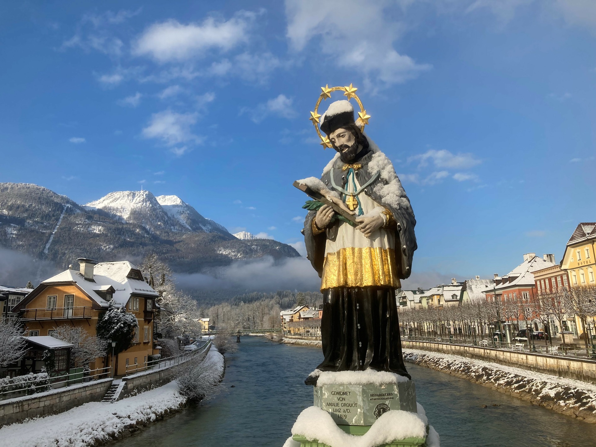 Beim Hochwasser von 1897 wurde die „Hauptbrücke“ zerstört, wobei auch eine um 1867 angebrachte hölzerne Statue des „Brückenheiligen“ St. Johannes-Nepomuk zugrunde ging, die auf der Brücke stand. Für die neue, 1900 eröffnete Eisenbrücke spendete 1899 Amalie Drouot aus Linz, ein langjähriger Sommergast und möglicherweise verwandt mit der Ischler Familie Vockenhuber, eine Gußeisenstatue des Heiligen. Zuletzt restauriert 2008 vom „Ischler Heimatverein“. 2014 verlor er durch einen Vandalenakt seinen Heiligenschein, der jedoch wieder ergänzt wurde.